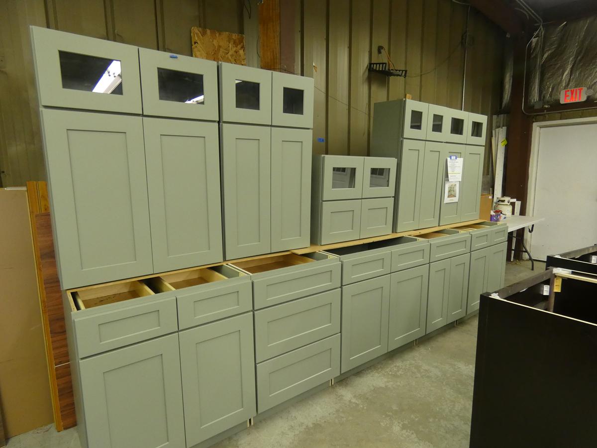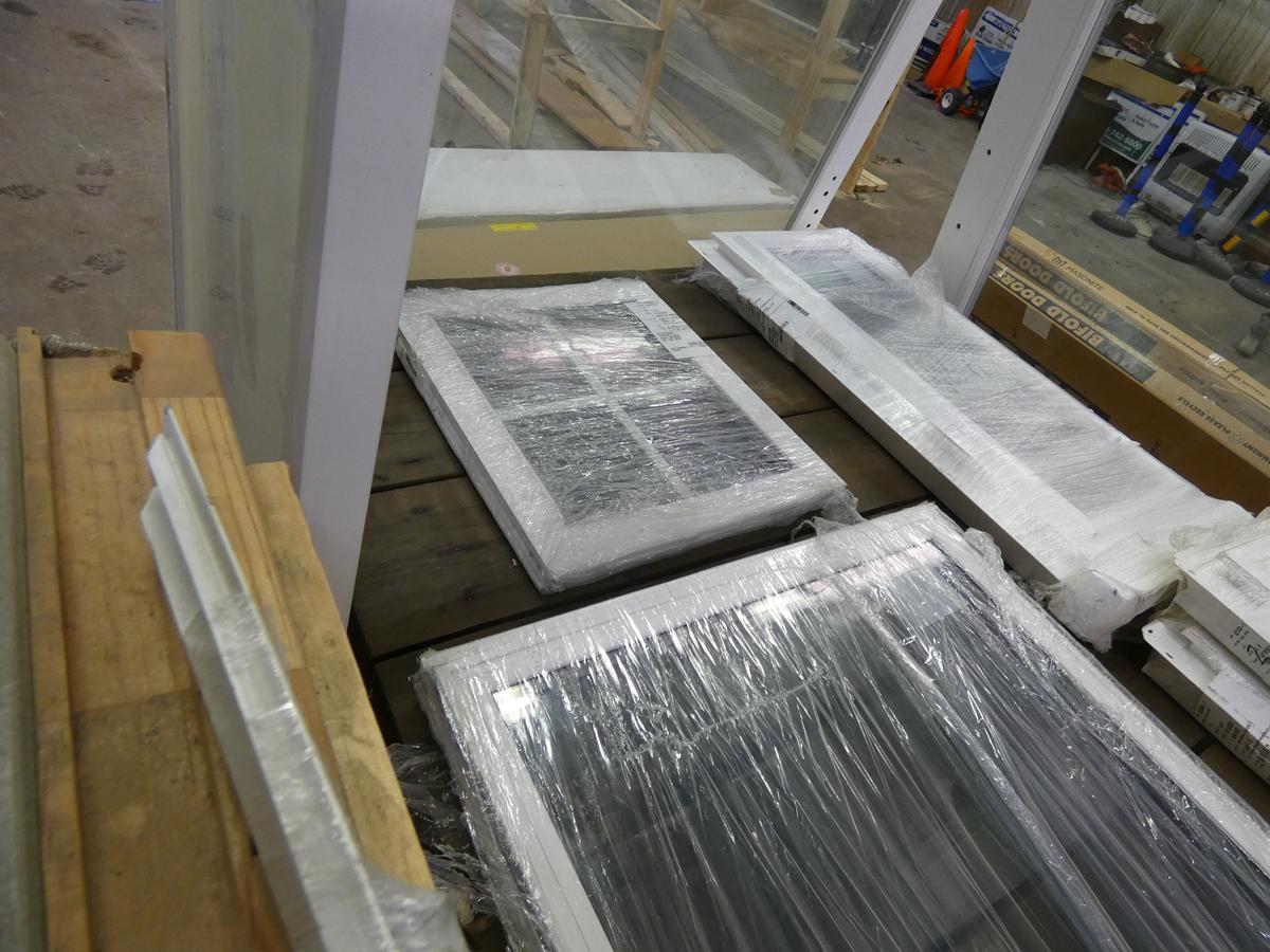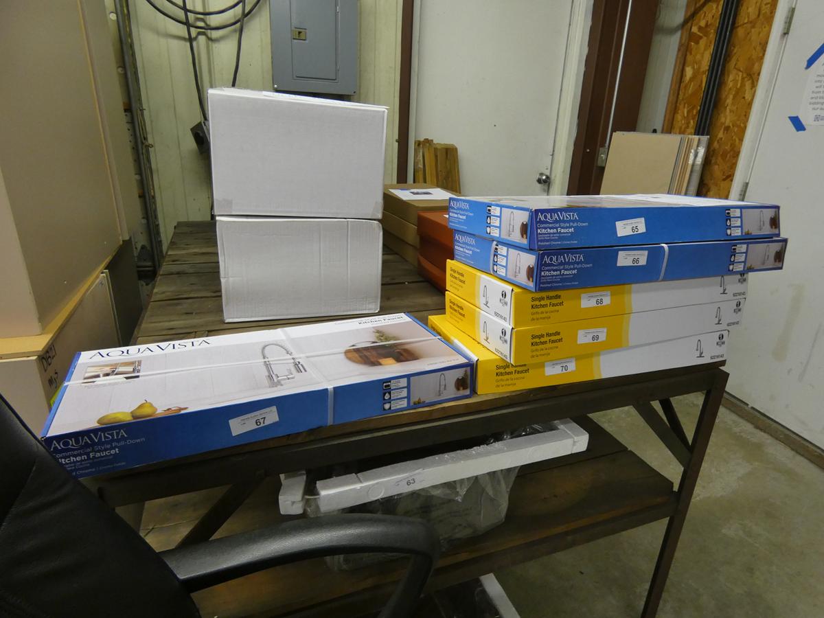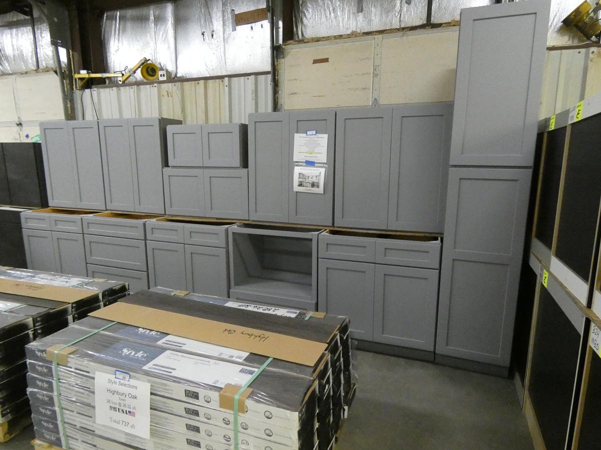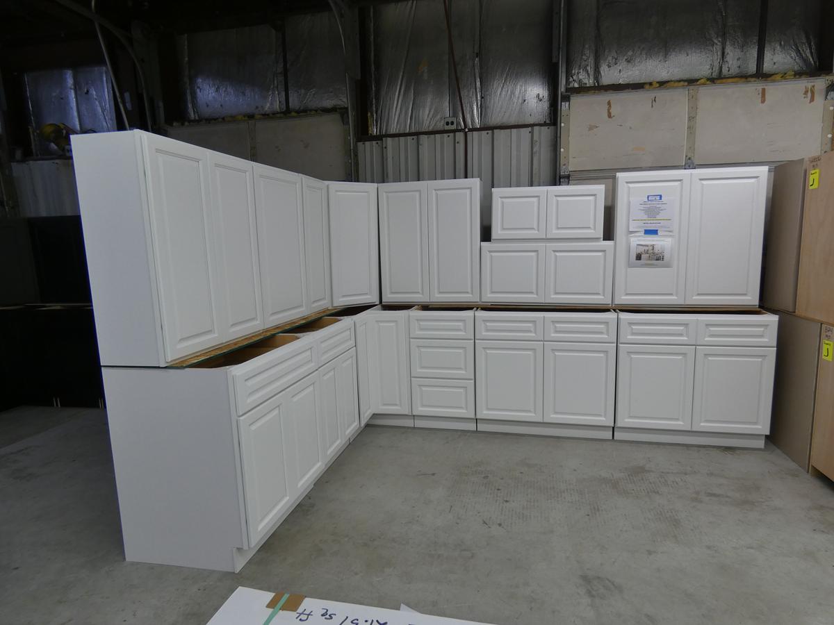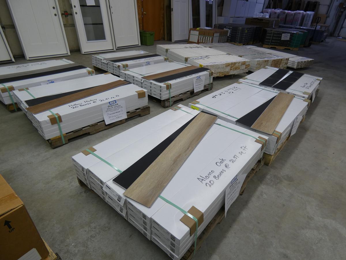 Seven kitchen cabinet sets with 12 – 16 pieces, flooring: laminate – vinyl – hardwood, bags of insulation, Jacuzzi tubs, French patio door, bathroom vanities, farmhouse sinks, stainless steel sinks, kitchen faucets, doors, laminate padding, wall sconces, trim, and much more! See bidding site for photos and details.
