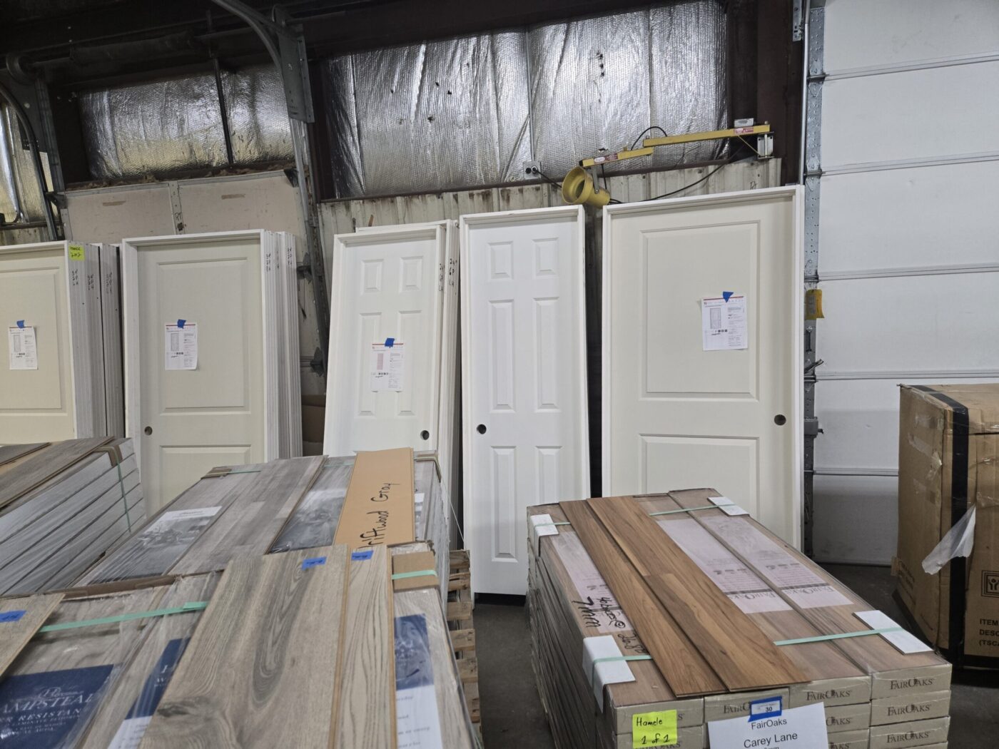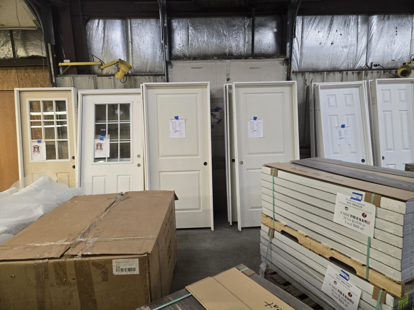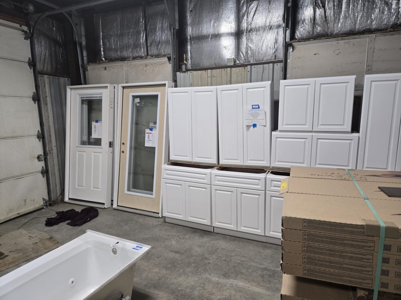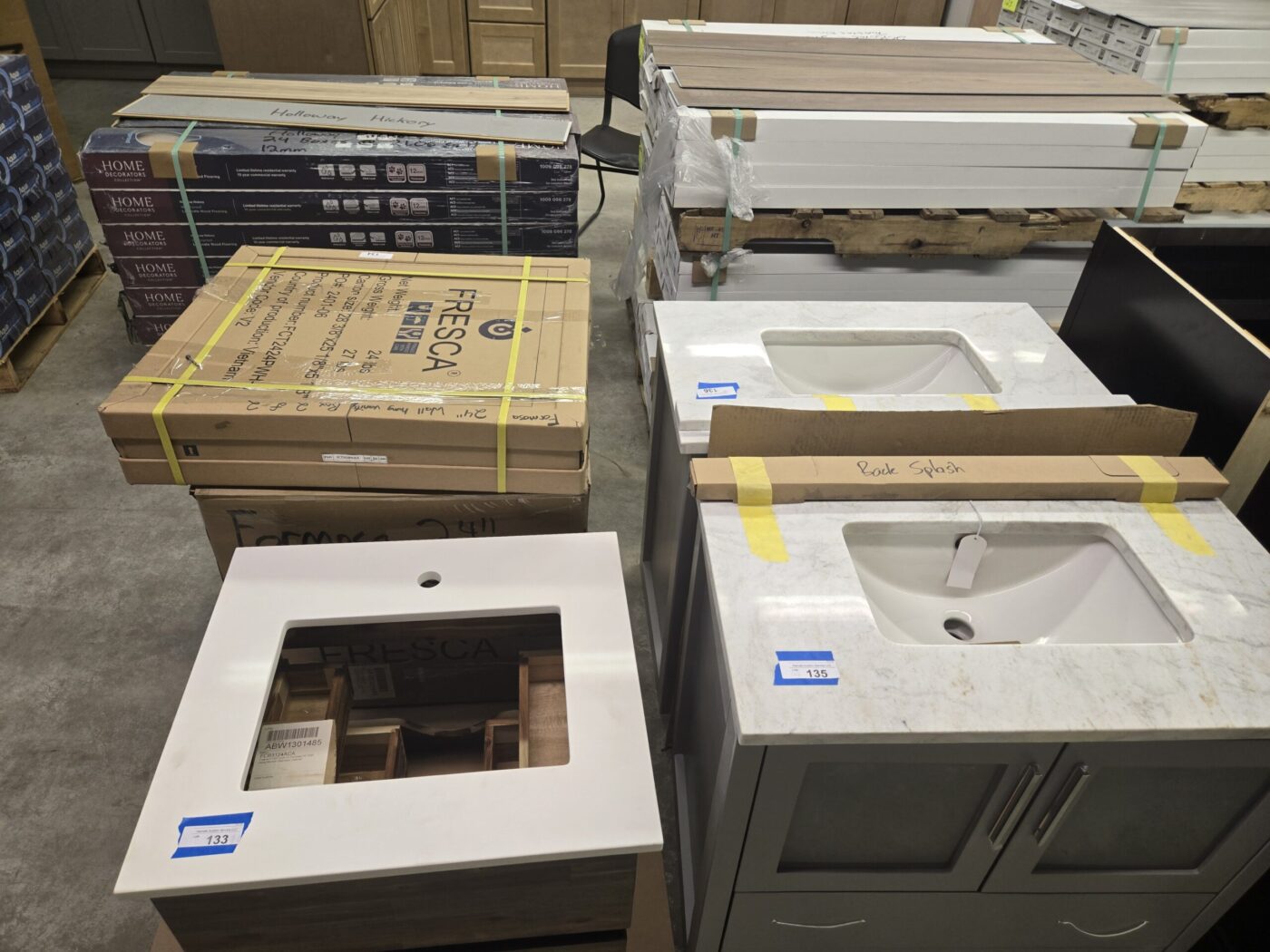 Kitchen cabinet sets, waterproof vinyl flooring, laminate flooring, hardwood flooring, tile, caret, base board, crown molding, doors, tubs, sinks, chairs, vanities, side cabinets, mirrors, faucets, door locks, bulbs, adhesives, hardware, paint, electrical items, nails, plumbing items and much more! See bidding site for photos and details.
