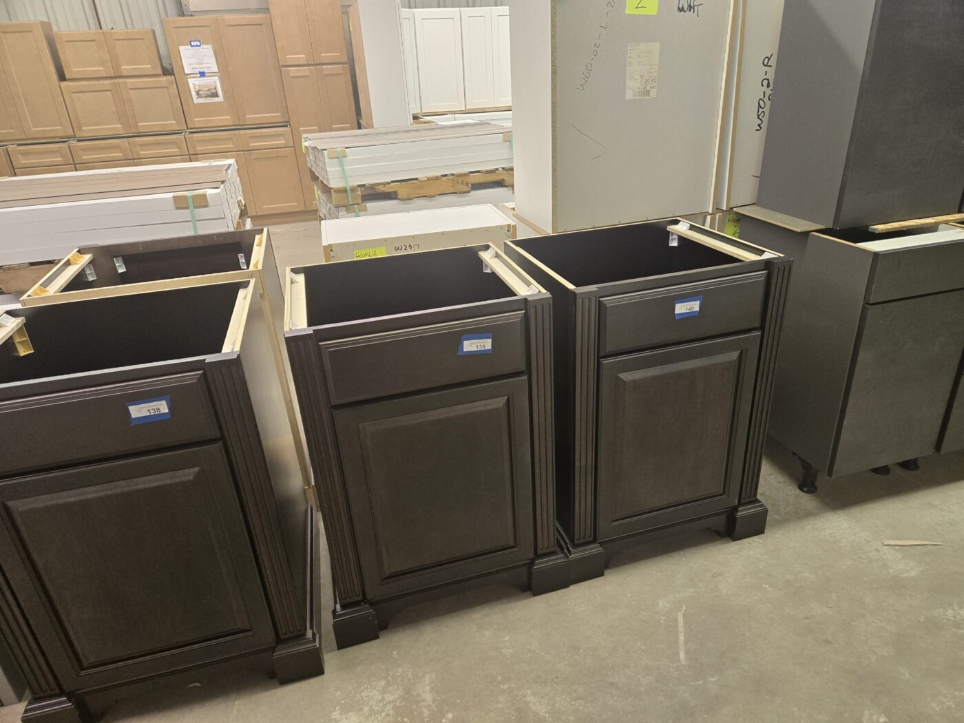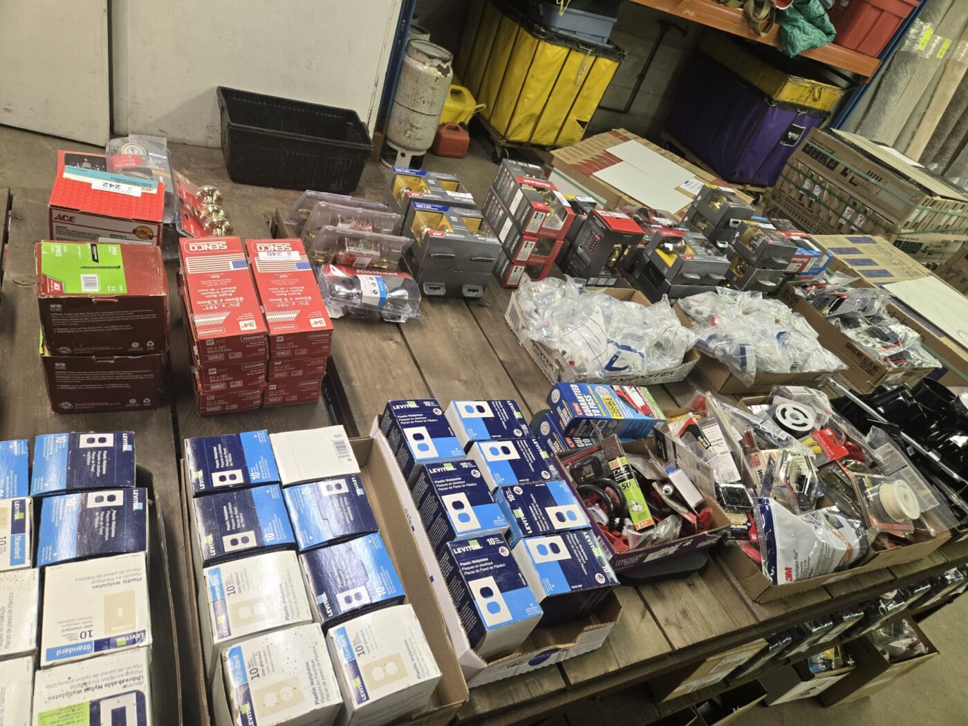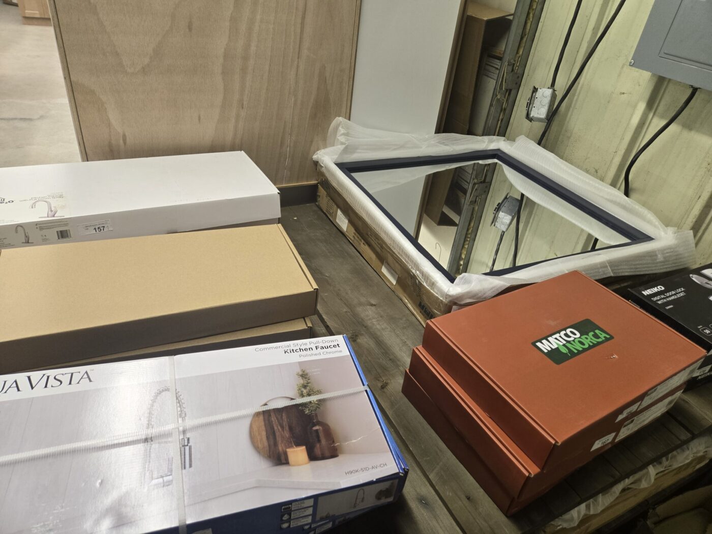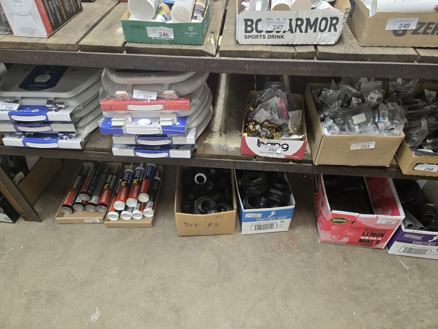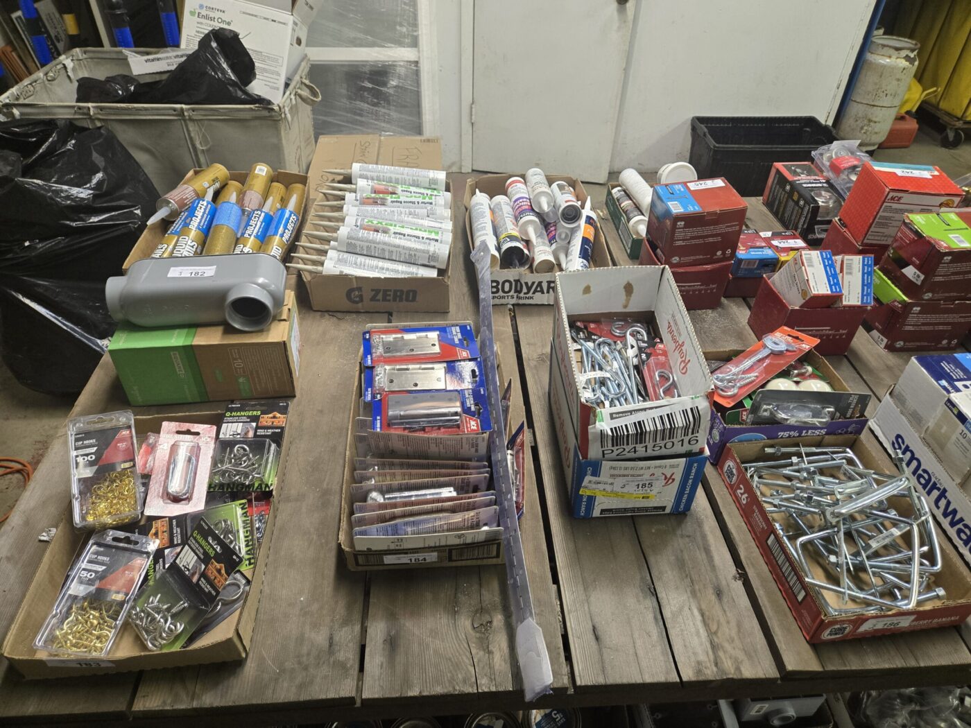 Kitchen cabinet sets, waterproof vinyl flooring, laminate flooring, hardwood flooring, tile, caret, base board, crown molding, doors, tubs, sinks, chairs, vanities, side cabinets, mirrors, faucets, door locks, bulbs, adhesives, hardware, paint, electrical items, nails, plumbing items and much more! See bidding site for photos and details.