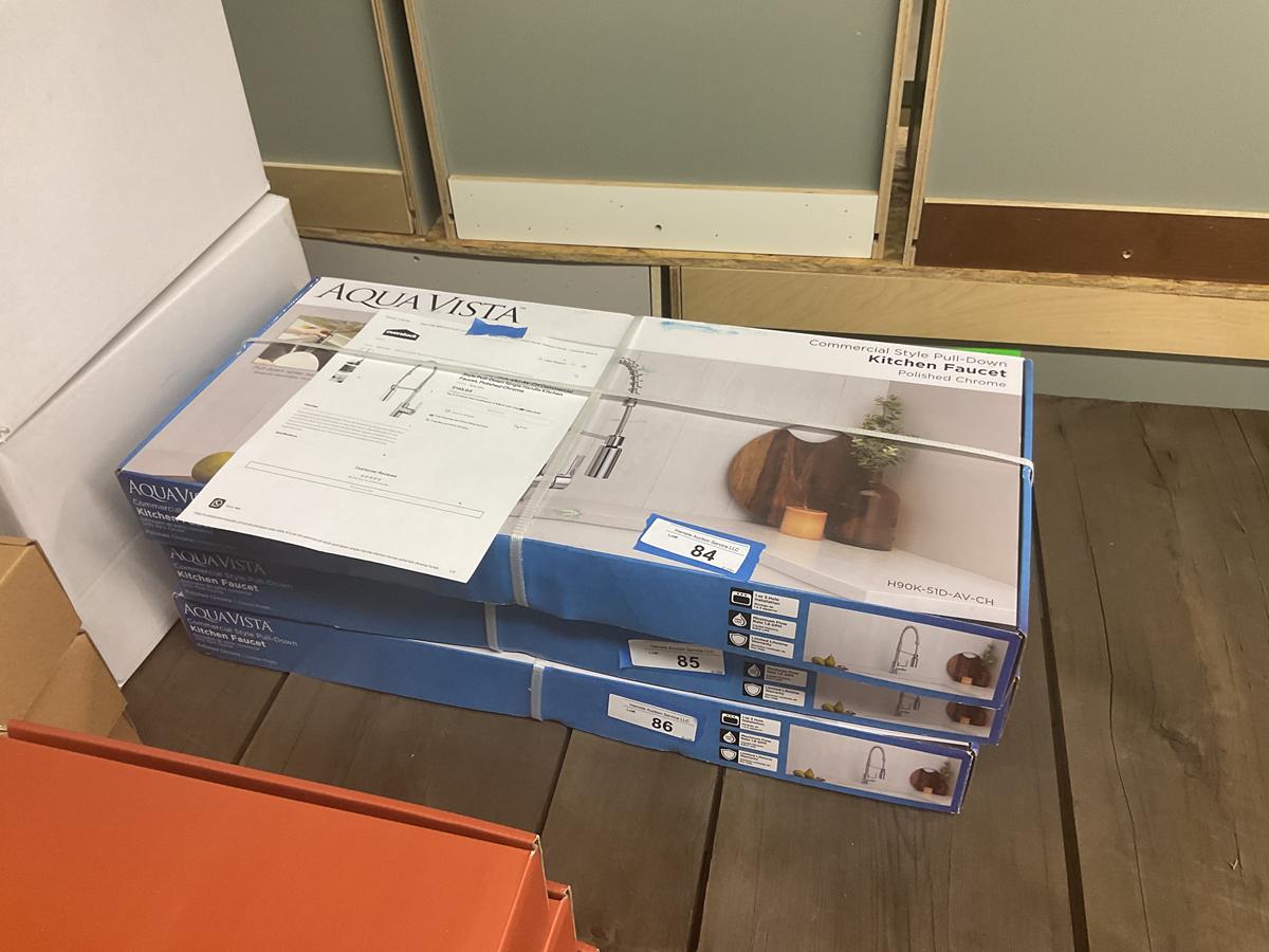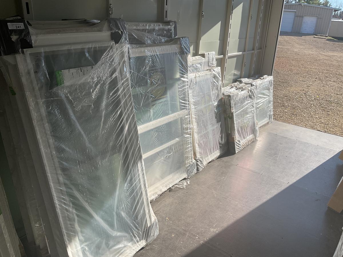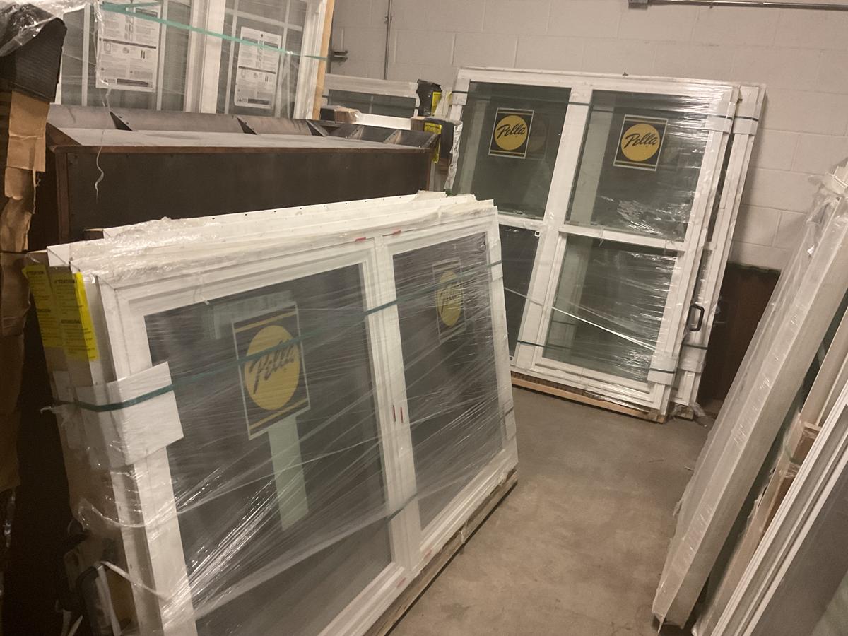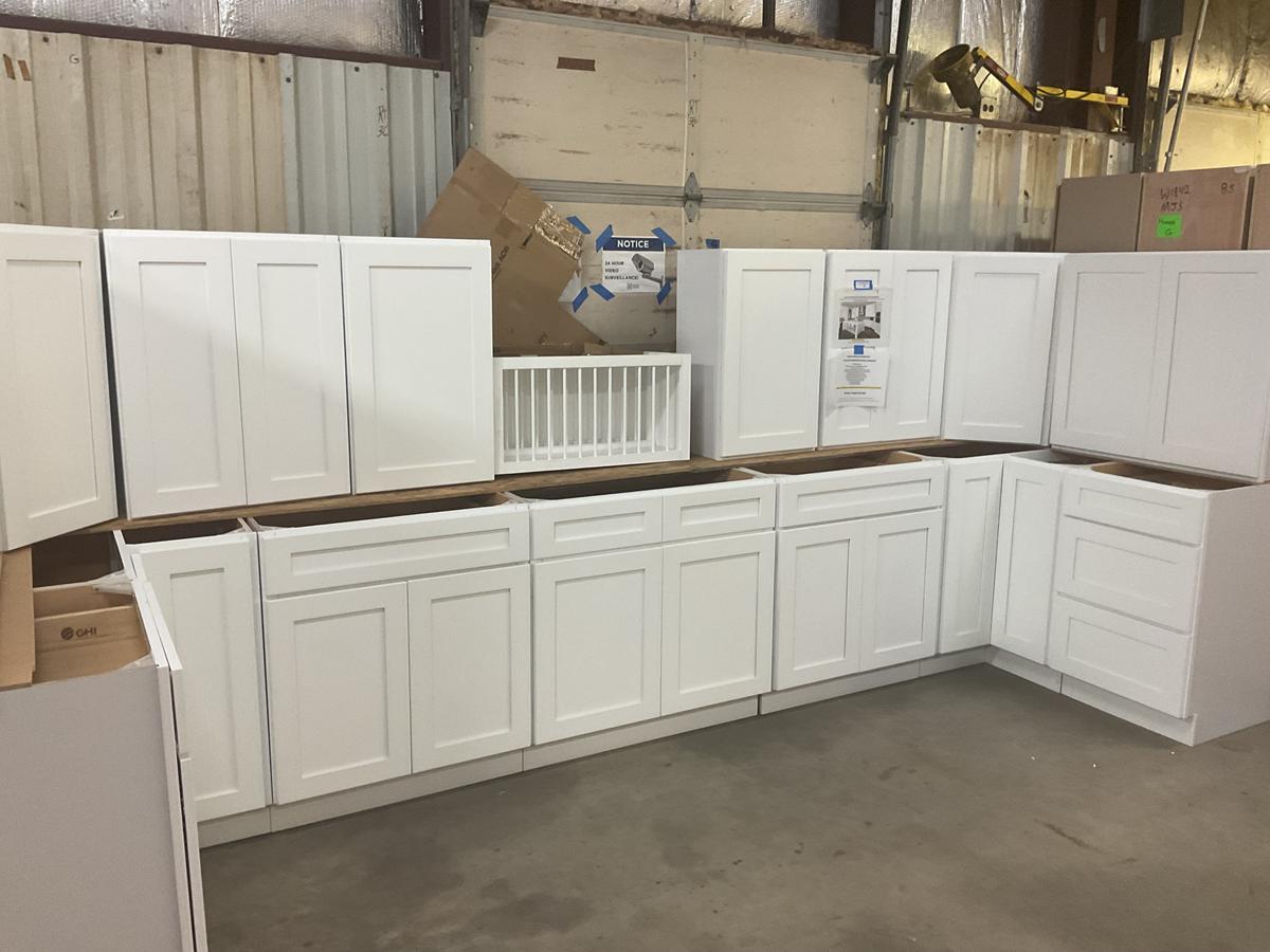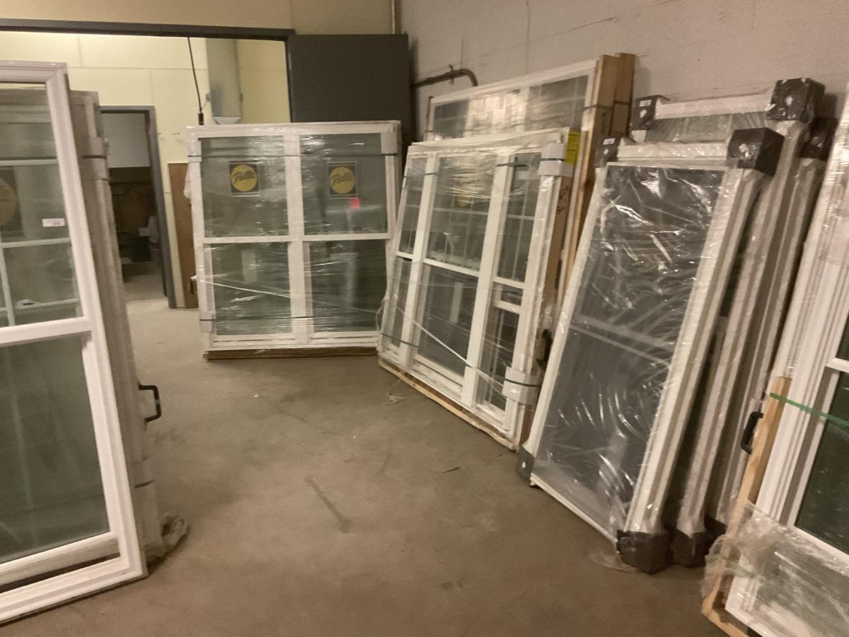 Many kitchen cabinet sets, variety of flooring, door jambs – mostly pine, trim – pine or MDF, insulation, Jacuzzi tubs, cement boards, tile, sinks – farmhouse & others, faucets, digital door locks, lighting fixtures, windows – many sizes & shapes, doors, shingles, lumber, steel beams, rib steel panels, and much more. See bid site for details and photos.